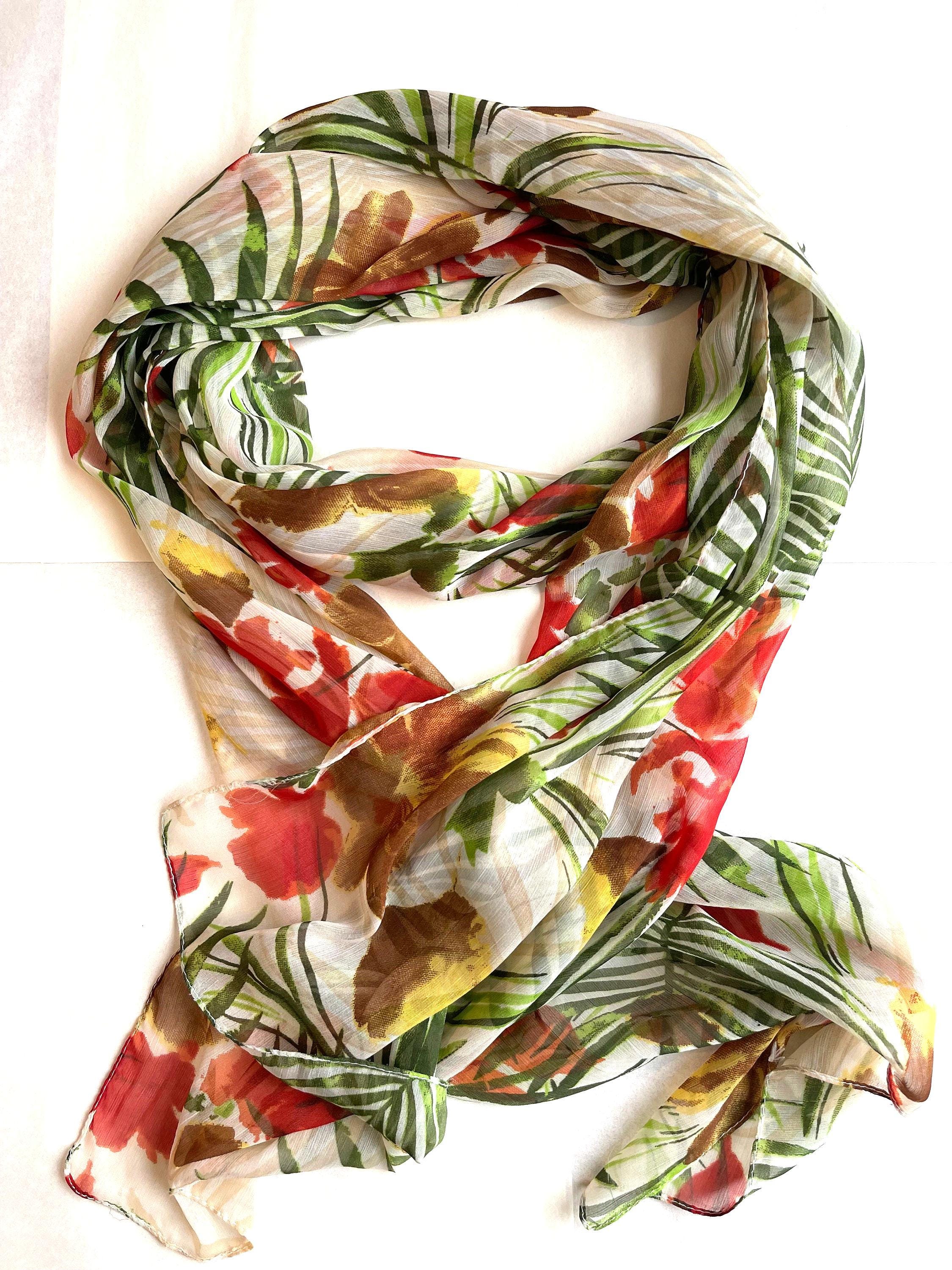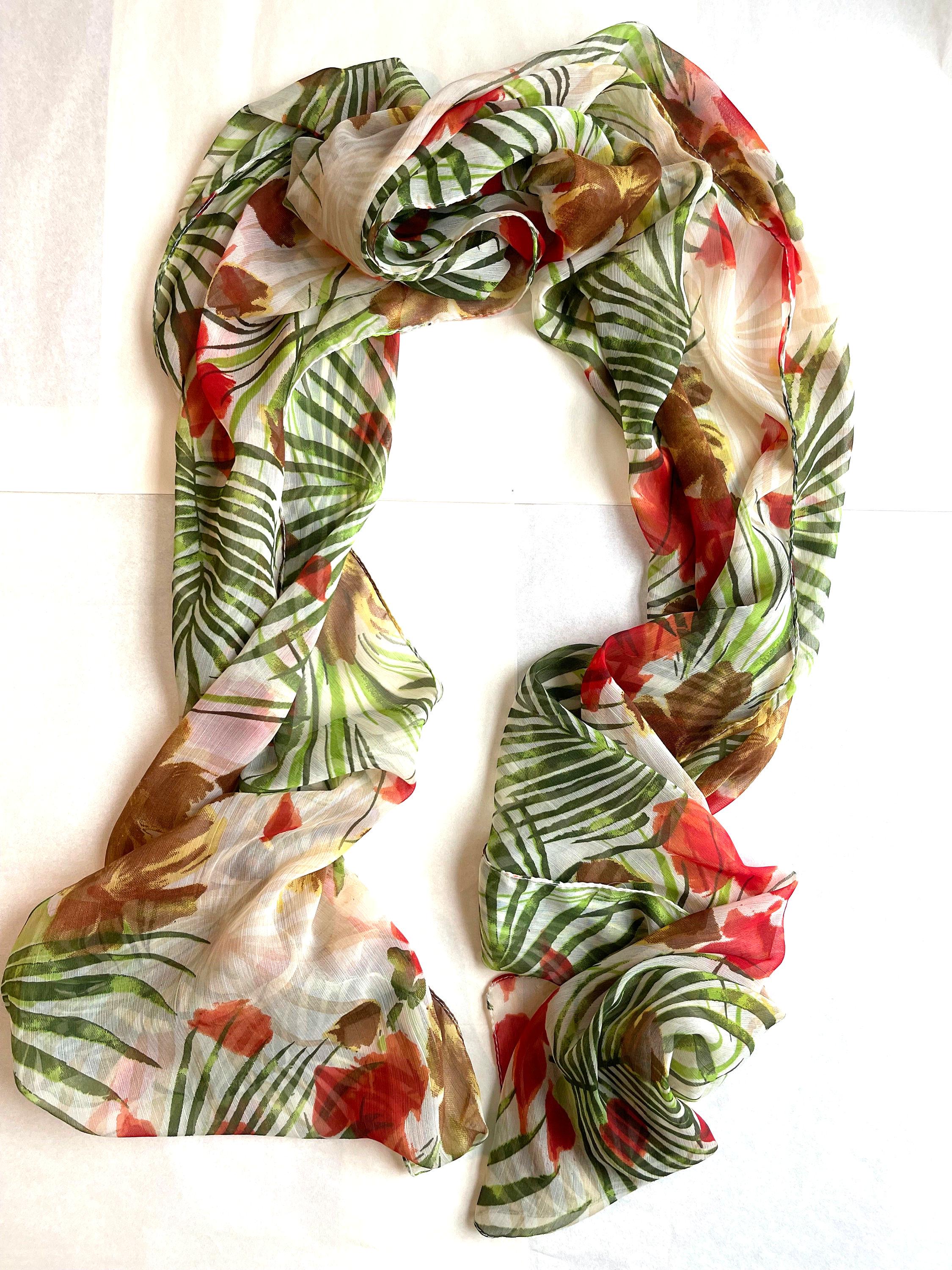 Modern floral design light as air sheer chiffon scarf with palm fronds and red-orange and yellow tropical hibiscus flowers.