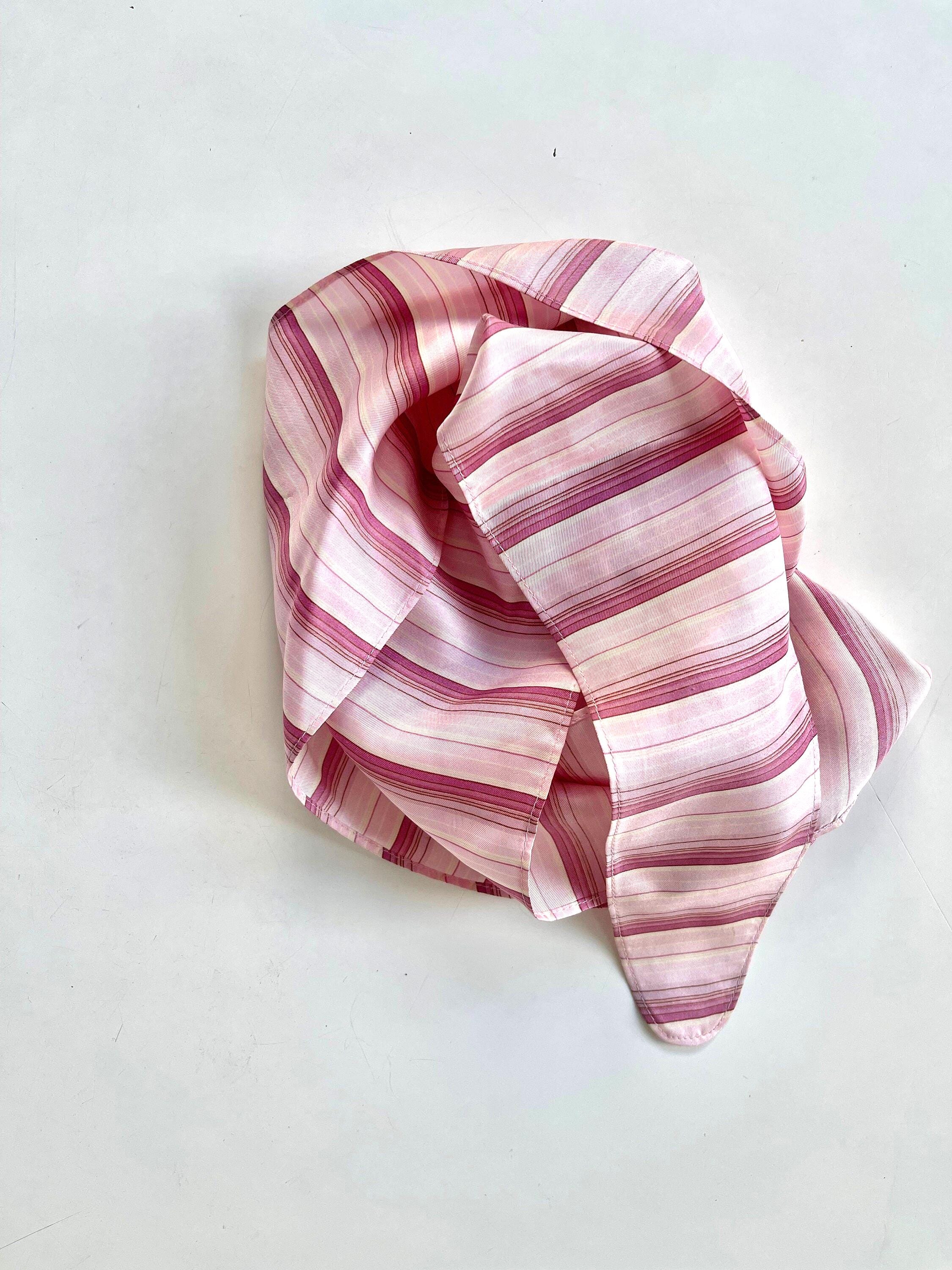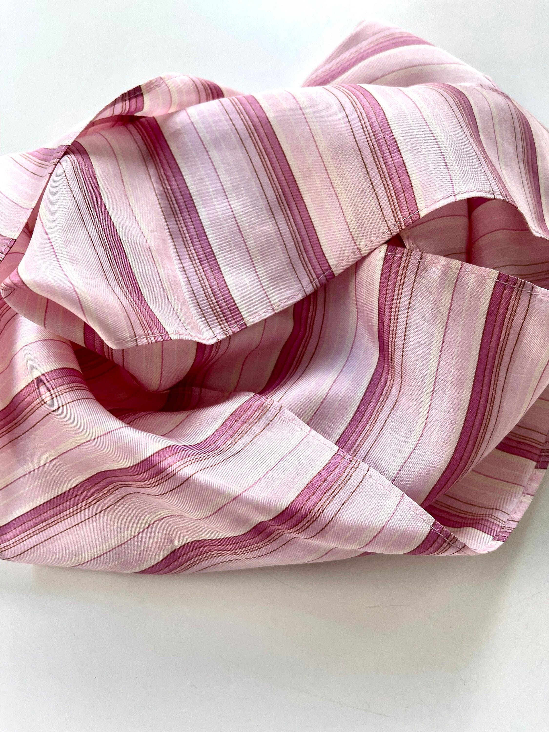 Unique tapered narrow silk scarf, great size for a head band tied scarf, pony tail scarf, cravat or neck scarf. Nice quality, lightweight silk. Fresh pink stripes.