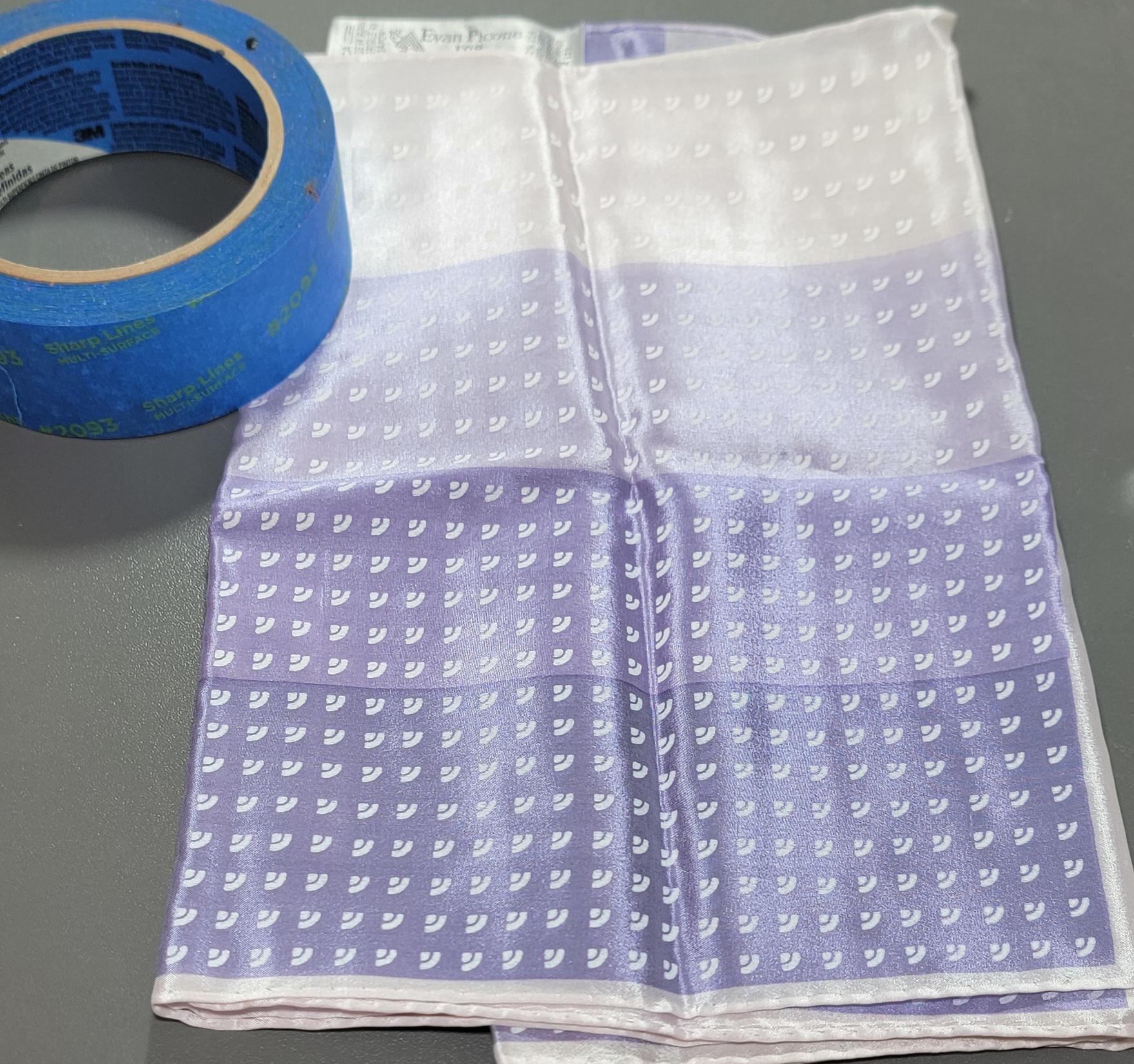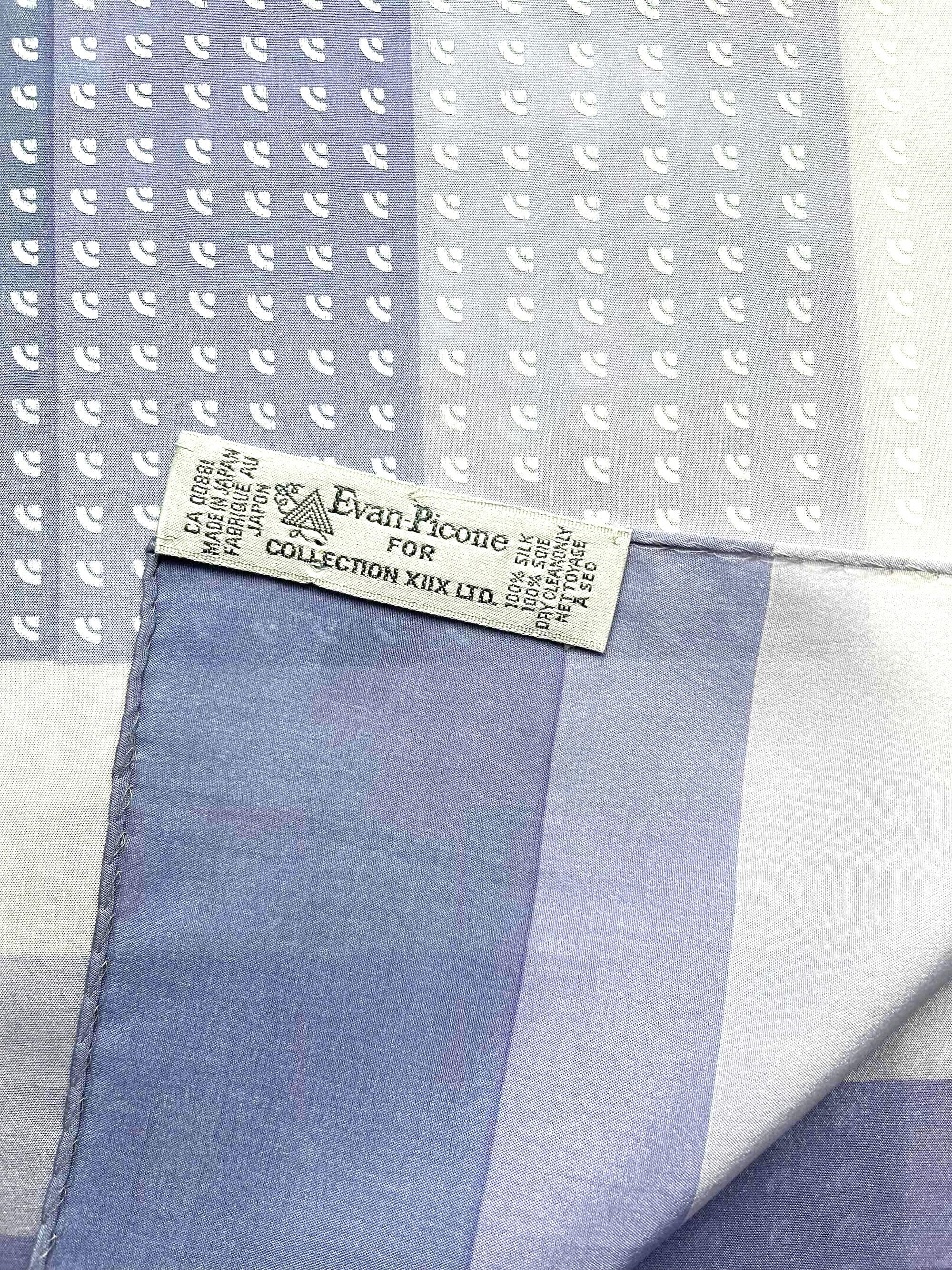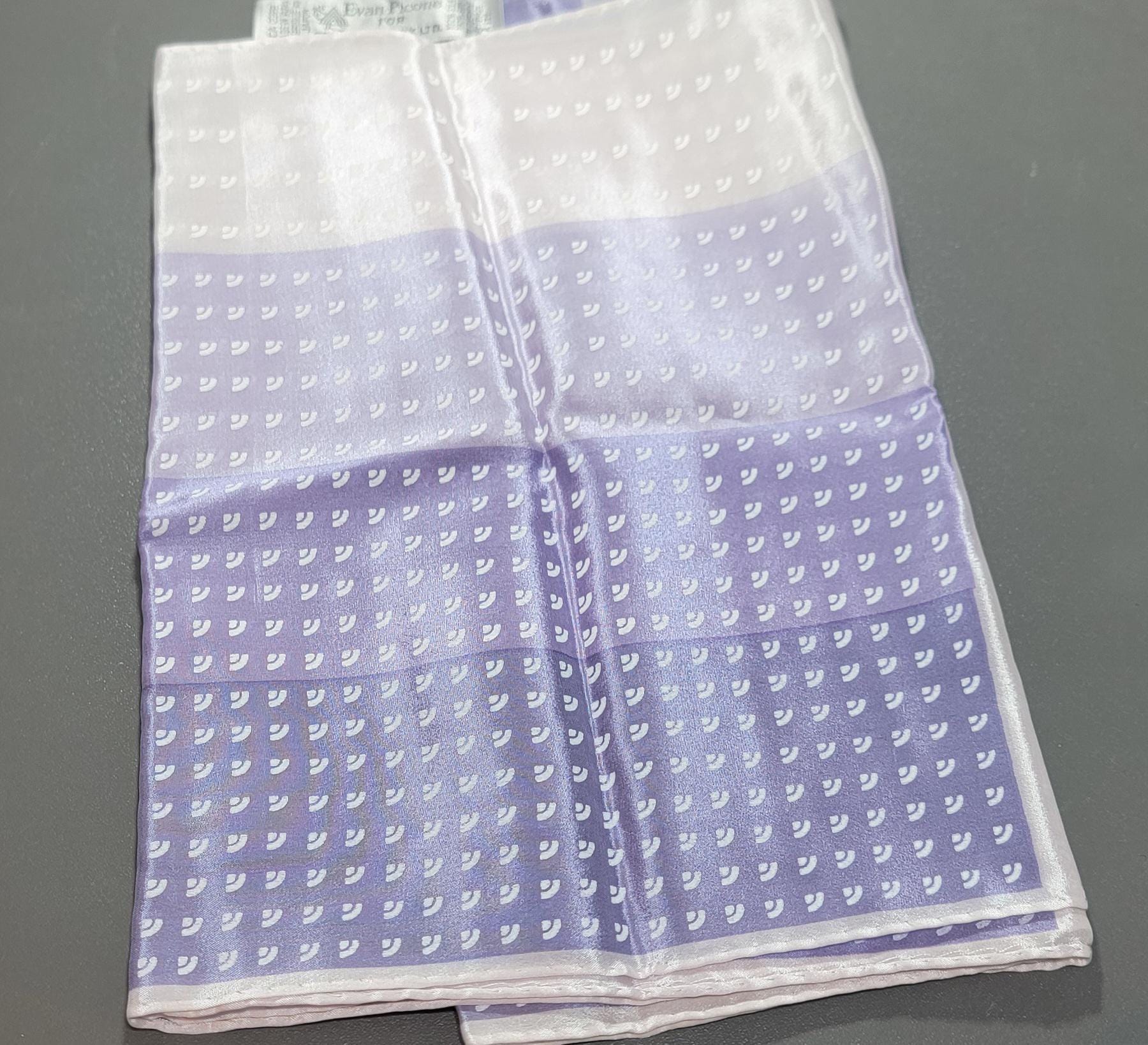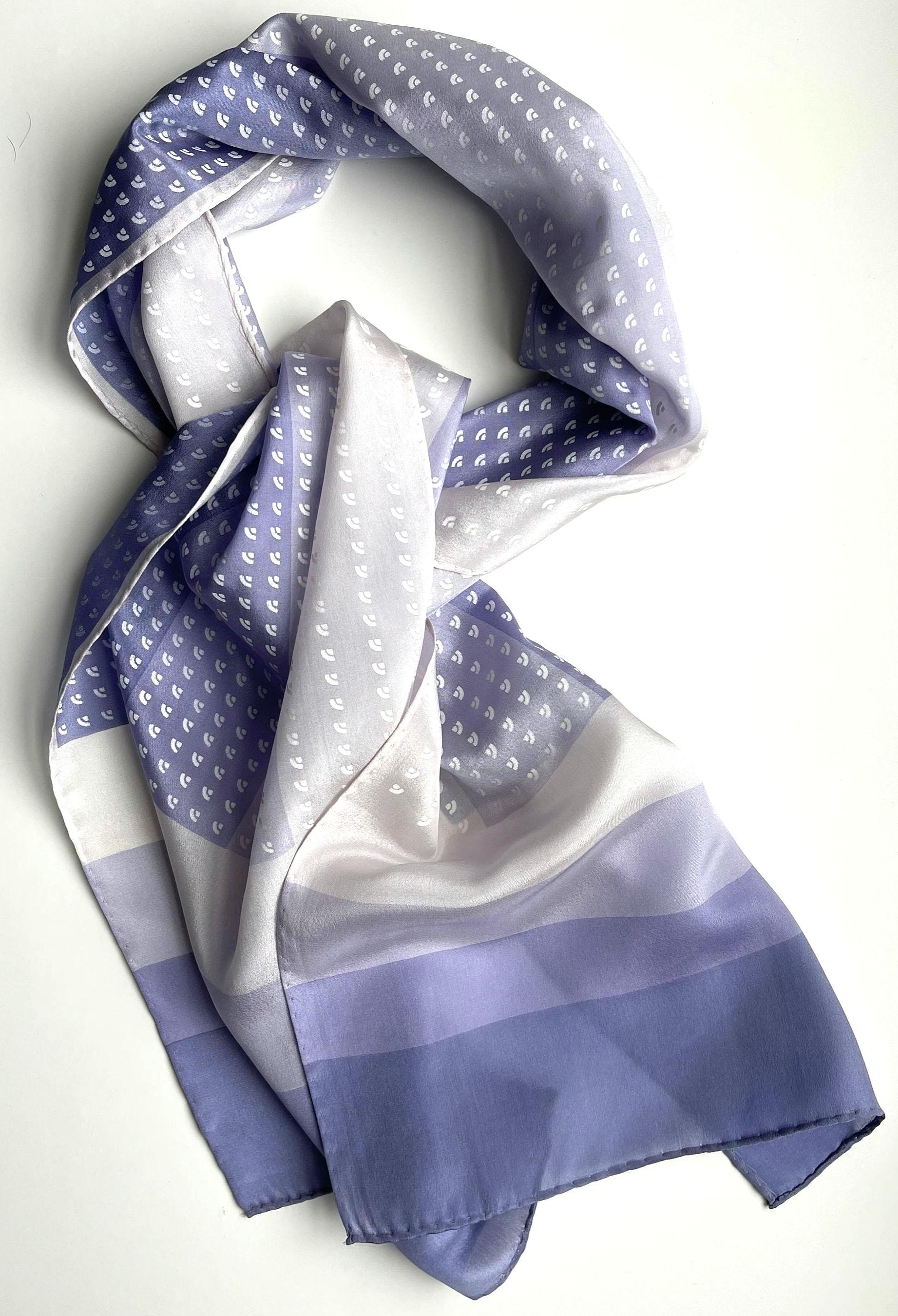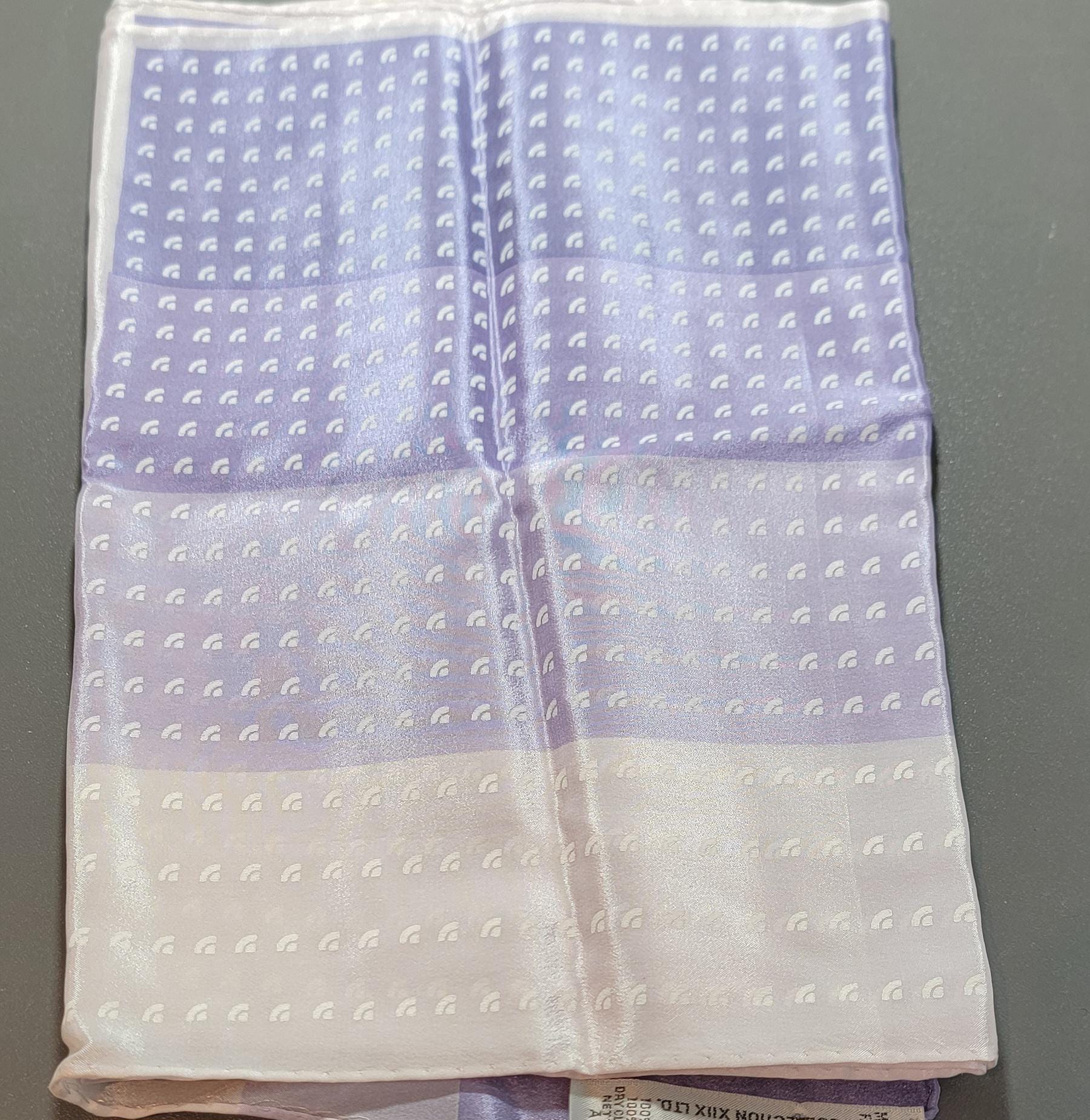 Subtle silk panel scarf in various purples and white. Small geometric design adds interest to the striped pattern. High quality lightweight Japanese silk and manufacture. Made in Japan, hand rolled edges.