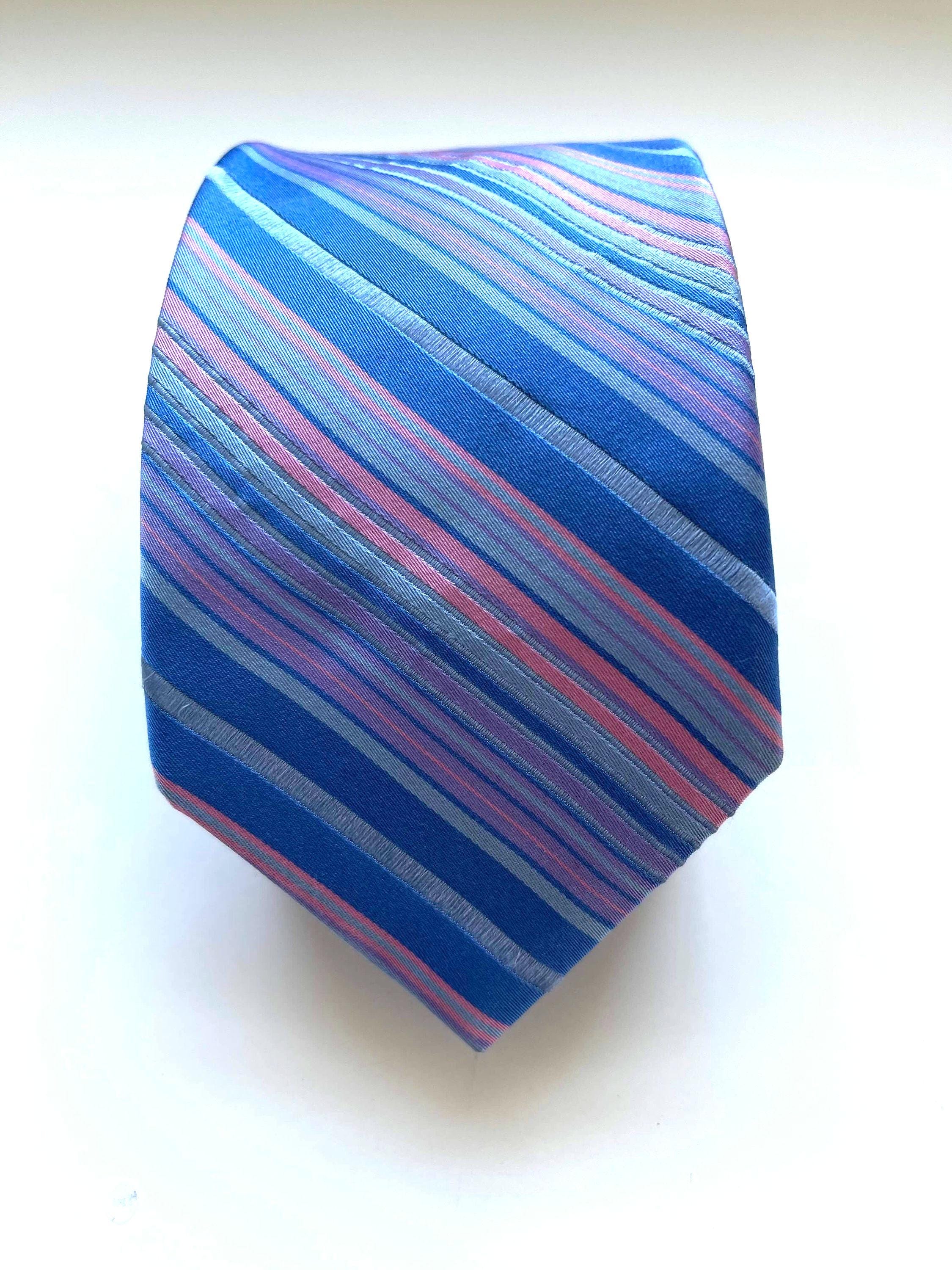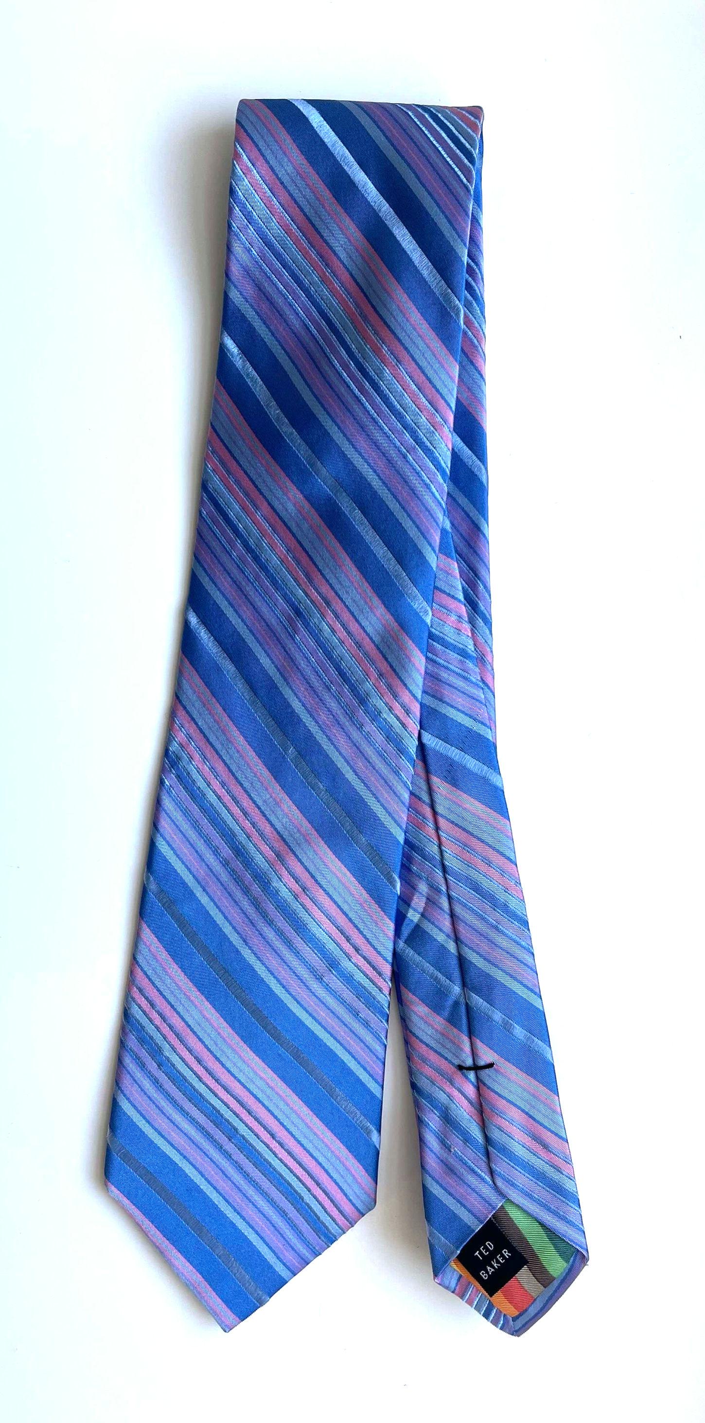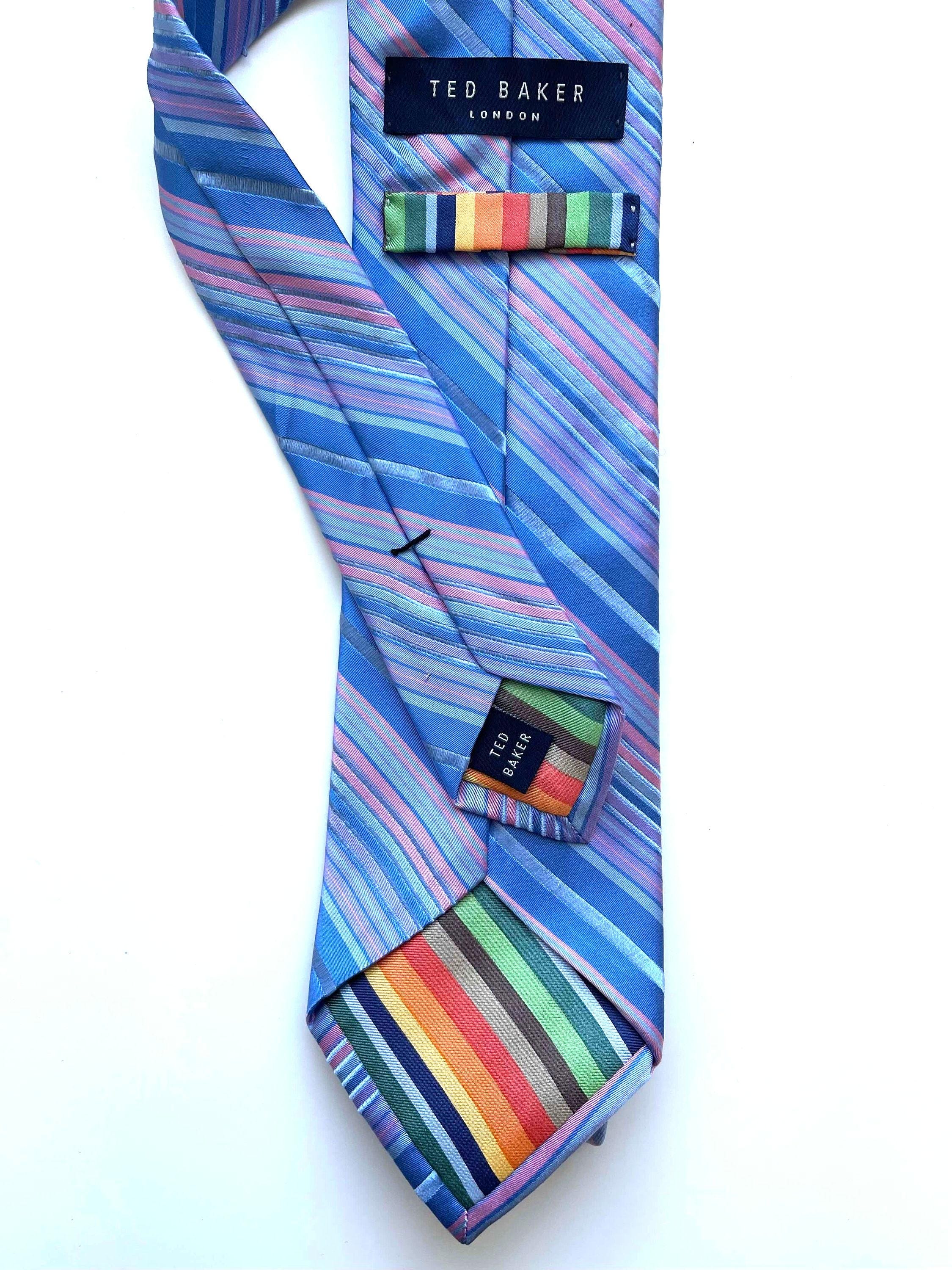 Silk tie by Ted Baker. Striped tie in multiple blues with pink. Stunning striped tie in charming spring colors.