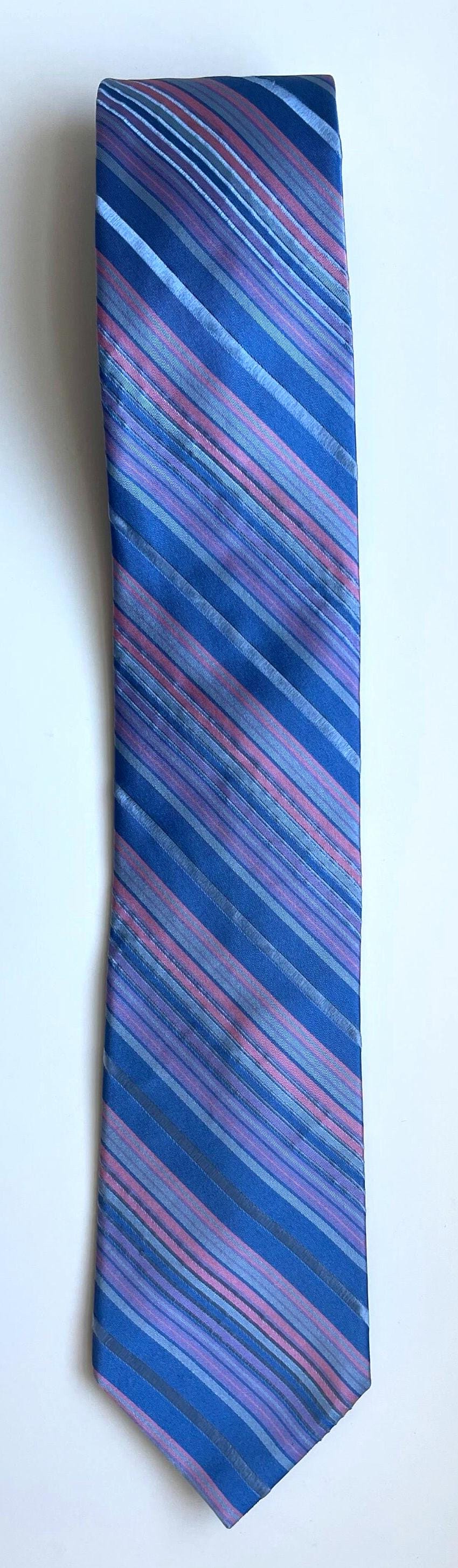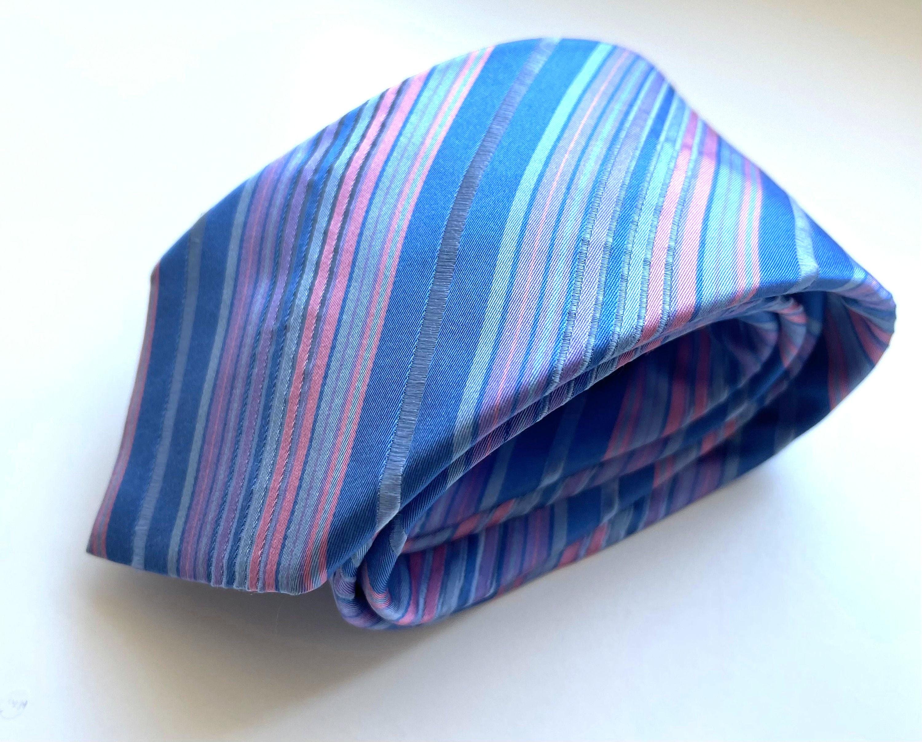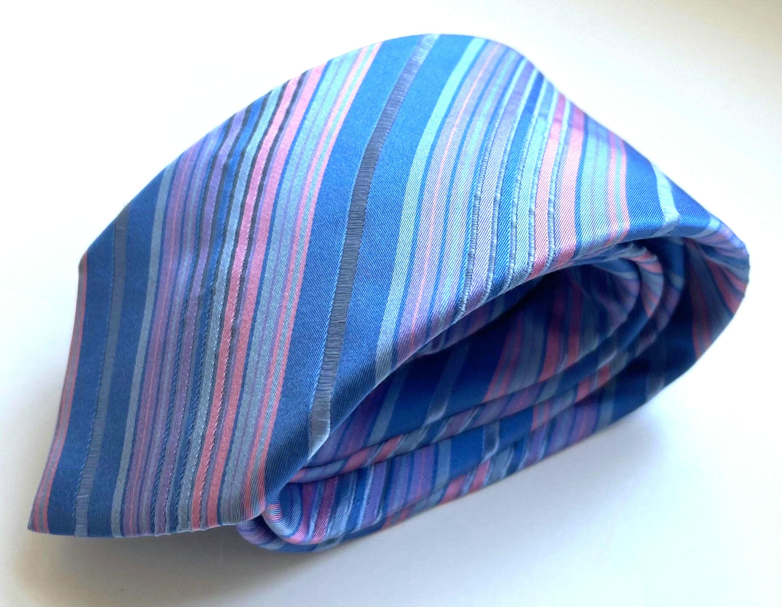 Silk tie by Ted Baker. Striped tie in multiple blues with pink. Stunning striped tie in charming spring colors.