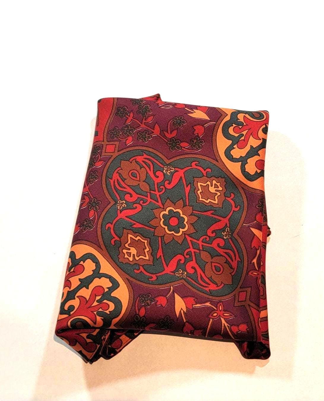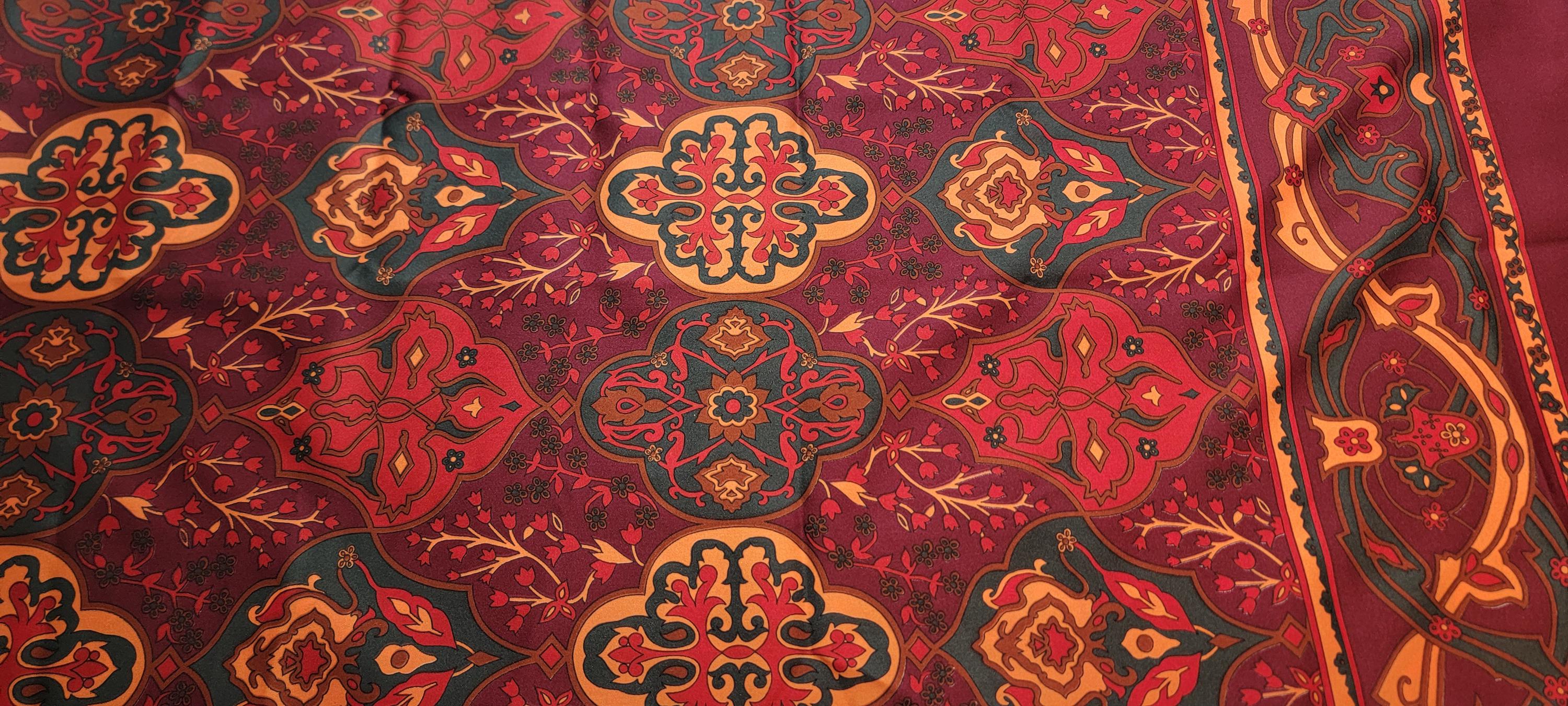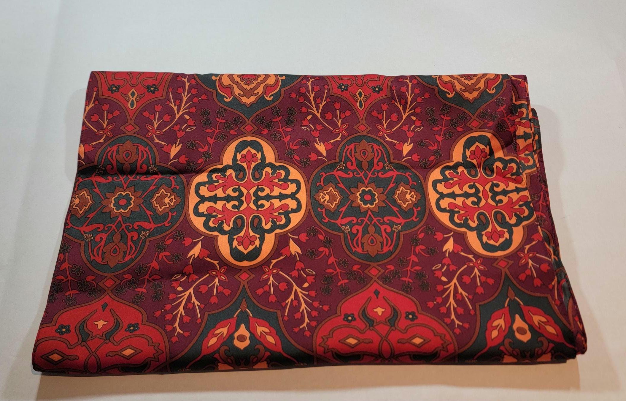 Gorgeous Maximalist Hot Tangerine Orange and Pink Neon accents throughout updates this traditional design. Dynamic Arabesque Design geometric style. Drapes beautifully, very soft. Exotic pattern.