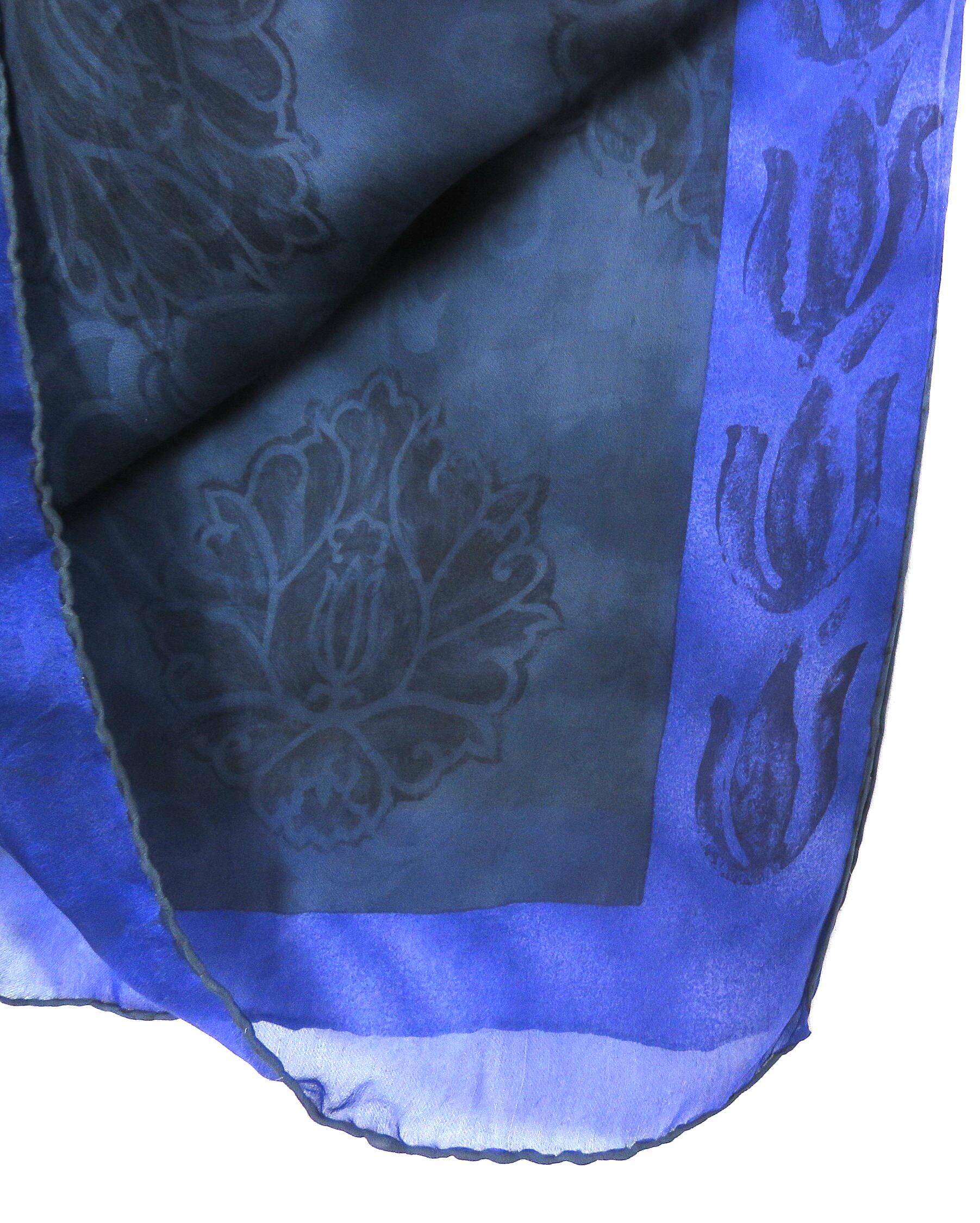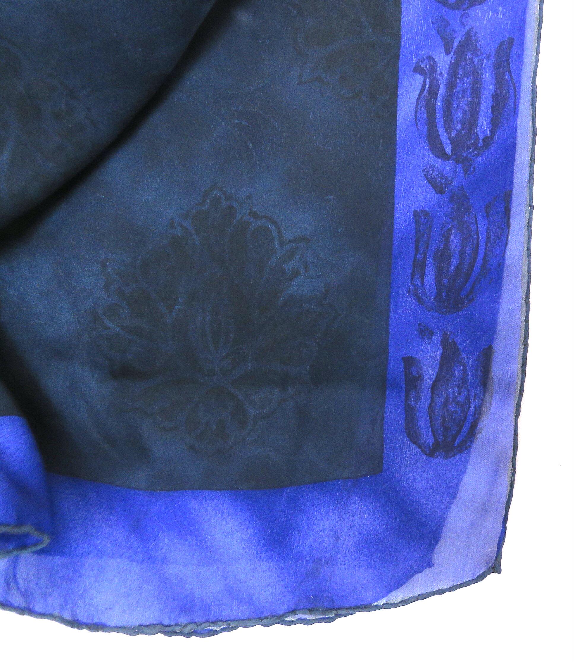 Subtle dark amethyst edge with abstract tulips goes fabulously with the midnight blue center which has a subtle arabesque floral design
