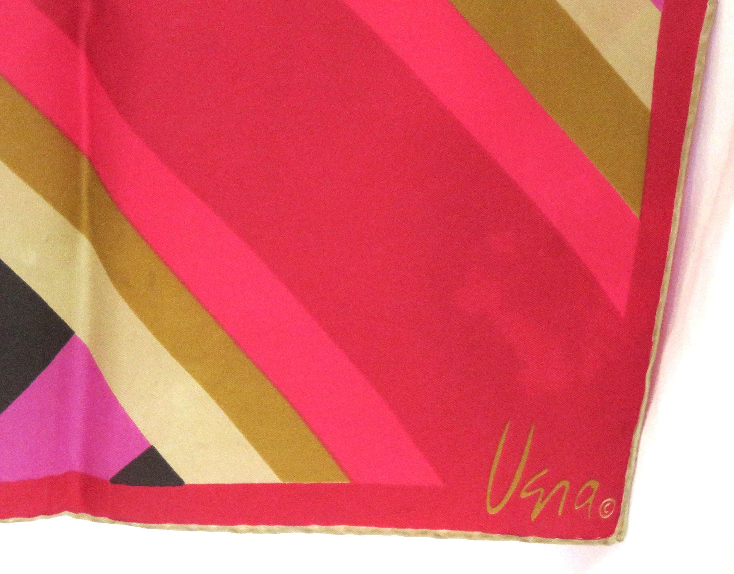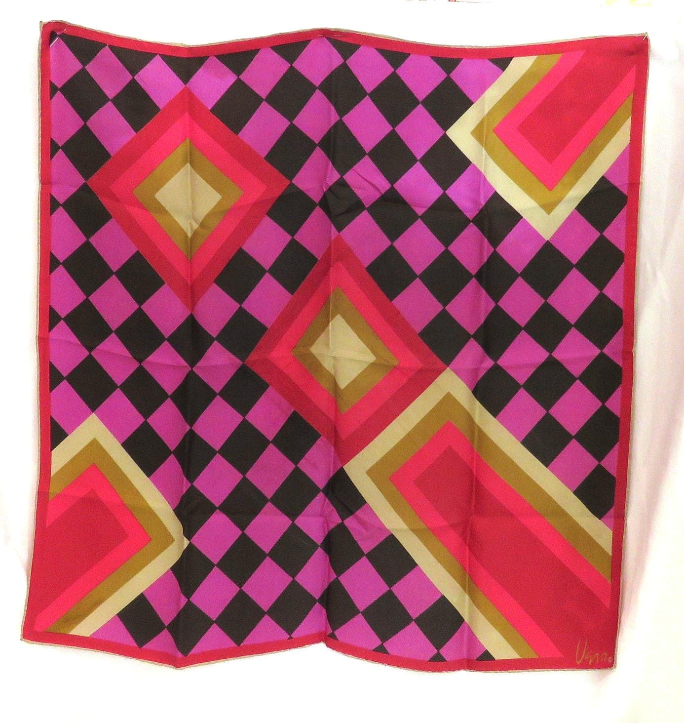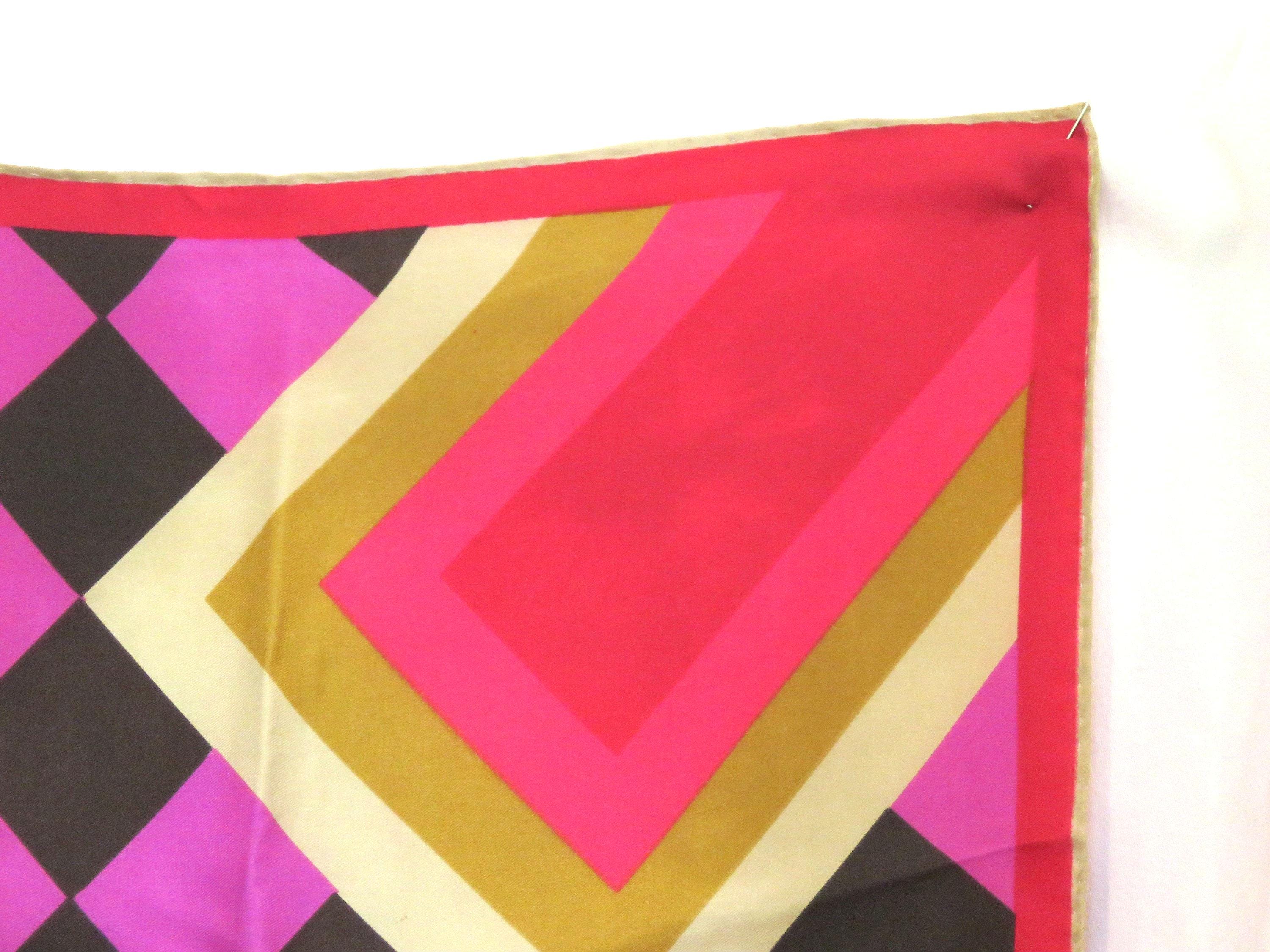 Fabulous vintage Vera silk scarf with a dynamic 60s design and amazing color combination of pinks, oranges, yellows. Geometric op art squares on a black on a magenta pink checkboard. Lovely soft silk with a great drape, nicely made with hand rolled hems.